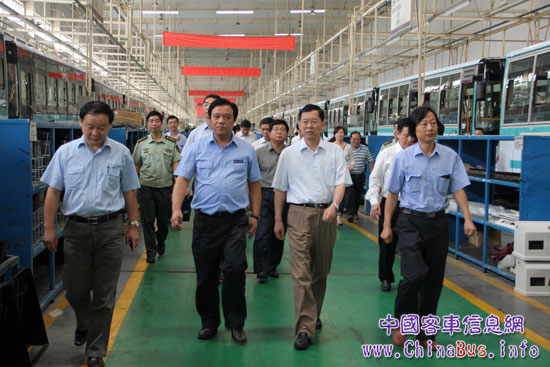 國(guó)家監(jiān)察部副部長(zhǎng)郝明金(左二)在恒通客車(chē)總經(jīng)理鄭先國(guó)(左三)陪同下參觀恒通生產(chǎn)線