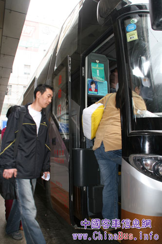 乘客登上金孔雀交運(yùn)的斯堪尼亞海格高檔客車