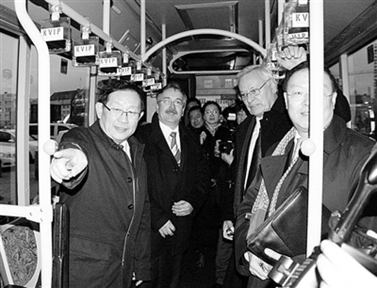 中國全國政協(xié)副主席、科技部部長萬鋼教授(左一)參觀首輛在德國運(yùn)營的中國產(chǎn)純電動公交車