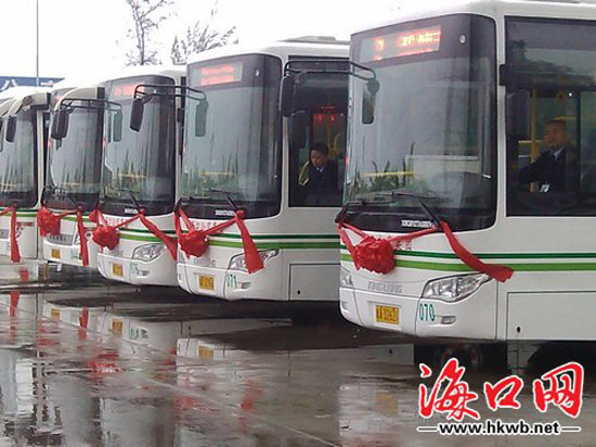27日上午,??谑兰o(jì)大橋底下,一輛輛節(jié)能環(huán)保公交車、出租車身披大紅花整齊地排列著,這是??诠患瘓F(tuán)今天投放的60輛純電動(dòng)公交車、100輛混合動(dòng)力型公交車和253輛純電動(dòng)出租車,使海口在節(jié)能與新能源客車裝備水平上步入全國(guó)先進(jìn)行列。