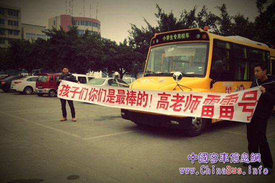 承載著所有中通人及高雷雷的愛心,“雷雷”號-中通長鼻子校車起航了。在看到校車的那一刻,高雷雷感動地哭了,并說到,“校車”你要好好保護我們的孩子,不讓他們再受傷害!為了能讓孩子們在年前坐上這輛校車,高雷雷開始了馬不停蹄的連夜奔波,給校車車檢,上牌照。終于,所有的上路手續(xù)準備完畢,高雷雷專門打印了條幅,希望這臺校車給孩子們帶來方便和安全,并將校車命名為“雷雷號”。