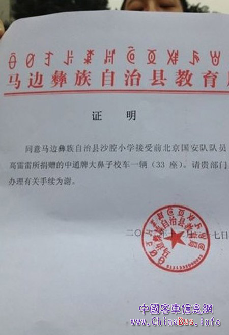 馬邊縣教育局接受高雷雷捐贈校車的證明