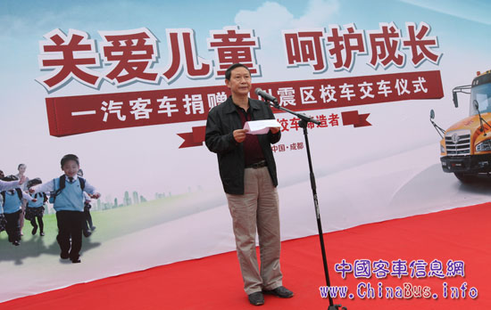 一汽集團(tuán)成都事業(yè)部黨委書記王琳致辭,一汽作為作為國有特大央企,堅(jiān)持踐行社會責(zé)任。繼前次捐贈55輛坤程皮卡和20輛解放J6L支持災(zāi)區(qū)重建,這次由一汽客車公司精心制造了6輛校車捐助給震區(qū)學(xué)校使用。這批校車是一汽客車歷時(shí)3年自主研發(fā)的精品,秉承了一汽“品質(zhì)、技術(shù)、創(chuàng)新”的品牌內(nèi)涵和“爭第一、創(chuàng)新業(yè)、擔(dān)責(zé)任”的價(jià)值理念,嚴(yán)格按照美國校車的制造標(biāo)準(zhǔn),完全滿足了《國標(biāo)》校車的技術(shù)標(biāo)準(zhǔn),安全性能遠(yuǎn)遠(yuǎn)超過普通公共汽車。