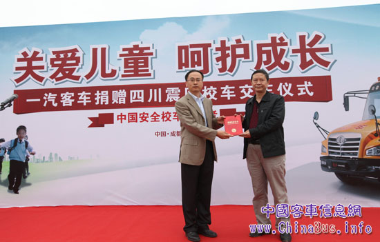 一汽客車有限公司副總經(jīng)理歐愛民(左)接受四川慈善總會秘書長楊秀華頒發(fā)捐贈榮譽(yù)證書