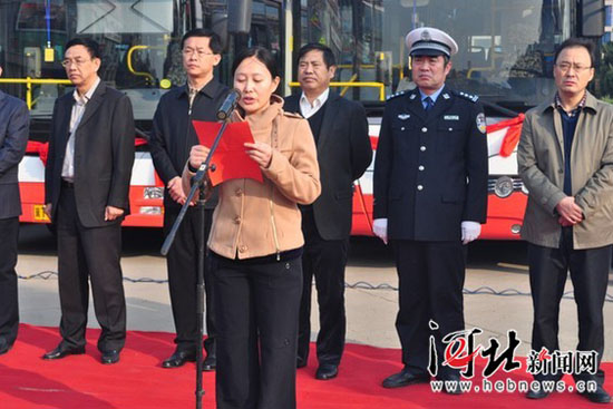衡水97部CNG天然氣公交車(chē)啟用儀式上,環(huán)保志愿者宣讀綠色出行倡議書(shū)