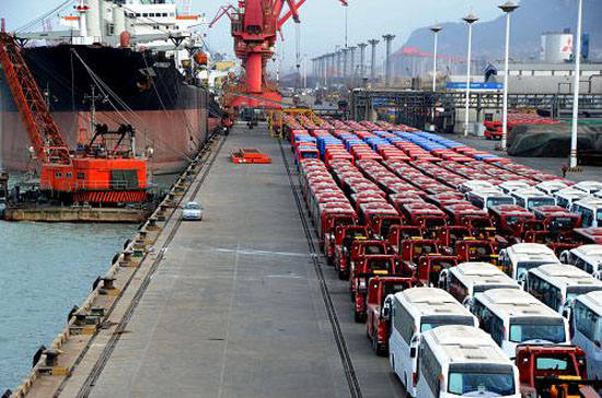 12月26日,大客車在連云港港口碼頭準(zhǔn)備裝船出口國外。當(dāng)日,近千輛河南生產(chǎn)的宇通牌大型客車從江蘇連云港港口碼頭裝船,準(zhǔn)備出口到委內(nèi)瑞拉,這是該港今年以來裝載客車最多的一次。2013年,連云港依托便捷的口岸優(yōu)勢,加大車輛出口的承攬力度,前11個(gè)月出口汽車已超萬輛。