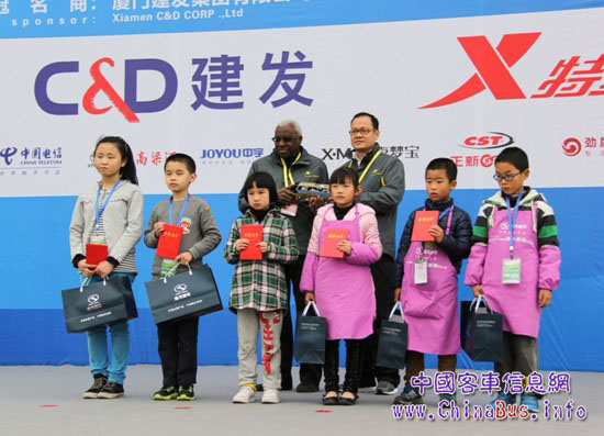 國際田聯(lián)主席迪亞克和大金龍副總經(jīng)理徐向東為獲得“金龍客車 百米畫卷”大賽一等獎(jiǎng)小朋友頒獎(jiǎng)