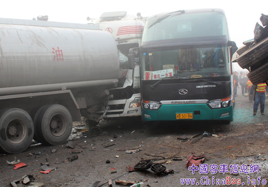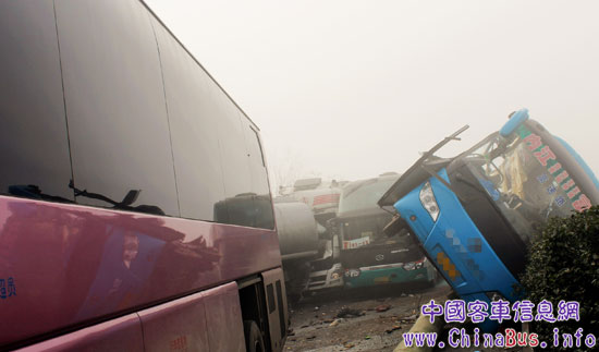 事故現場多輛大客車追尾或側翻,后部綠色客車為無人受傷的大金龍6129Y5