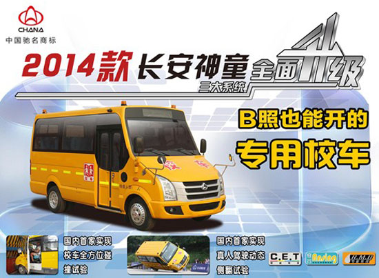 長(zhǎng)安校車不僅將周到服務(wù)送到家,而且還帶來(lái)了更高品質(zhì)的校車產(chǎn)品。2014年初,長(zhǎng)安發(fā)布了2014款長(zhǎng)安神童校車,該車型中最小車長(zhǎng)5.1米,為目前市場(chǎng)最小,座位數(shù)可達(dá)19個(gè),持B照也能駕駛。該車型將在2014年正式上市,是長(zhǎng)安客車為中國(guó)校車市場(chǎng)打造的又一款精品。目前長(zhǎng)安校車正在全國(guó)的縣鄉(xiāng)市場(chǎng)開(kāi)展專業(yè)校車巡展活動(dòng),將高品質(zhì)的校車產(chǎn)品帶到用戶家門口,零距離感受長(zhǎng)安校車。