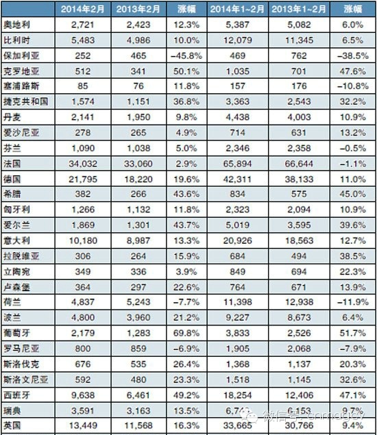 1~2月,歐盟市場下降2.2%,新增注冊量總量為4326輛。其中,西班牙和英國市場均呈現(xiàn)下跌,西班牙跌幅為16.5%,英國跌幅為10.3%;實現(xiàn)增長的國家有法國(漲幅為13.5%)、德國(漲幅為8.3%)和意大利(漲幅為0.5%)。