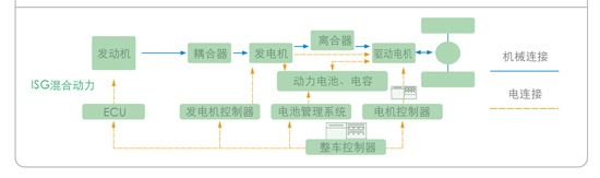 要保持強大的動力,除了采取最優(yōu)的新能源組合模式,車輛自身的混聯系統亦為關鍵。目前國內的該類車型,主要采用BSG混聯系統,即采用皮帶傳動發(fā)電機的驅動方式。而更為先進的ISG混聯系統,是由電機和發(fā)動機直接驅動車輛驅動輪,中間不需要變速箱進行動力傳遞與扭矩的變換,減少了變速箱系統對動力的損耗,傳動效率更高。