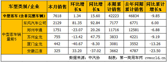 環(huán)比上月,銷量前5的企業(yè)兩家實(shí)現(xiàn)正增長,與去年同期相比有兩家出現(xiàn)下滑。東風(fēng)汽車公司以7月銷售2129輛,環(huán)比增長81.35%,同比增長92.84%的成績,不僅奪得7月中型客車(含非完整車輛)銷量冠軍,增長率也是各家企業(yè)最高,成為7月中型客車市場的最大亮點(diǎn)。