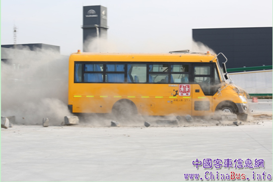 事實上,即使是更厲害的碰撞,比方說更大型的車輛,或者更堅固的設(shè)施,宇通校車也是可以應(yīng)付的。獨特的長頭設(shè)計——“大鼻子”,可以讓碰撞發(fā)生的時候,最大程度的起到緩沖作用。在東方衛(wèi)視《巔峰拍擋》第五集中,田亮親自駕駛宇通校車撞向一堵寬約三十公分的水泥硬墻,墻壁坍塌塵土滾滾,但校車受損極少,連車頭大燈都沒有破損,駕乘人員生存空間未受侵入,發(fā)動機能夠照常啟動并駛離現(xiàn)場,宇通校車的安全性由此可見一斑。