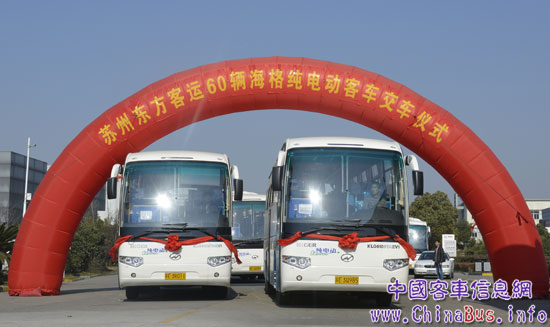 12月23日,60輛海格純電動(dòng)大巴KLQ6109TAEV交付給蘇州最大的班車租賃公司——蘇州市東方客運(yùn)有限公司(以下簡(jiǎn)稱東方客運(yùn)),此舉標(biāo)志著蘇州市客車團(tuán)體租賃跨入純電時(shí)代。