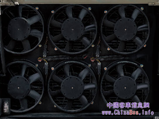 針對(duì)湖南地區(qū)夏季炎熱的特點(diǎn),該批車輛還裝配了金龍自主研發(fā)的智能冷卻系統(tǒng)。該系統(tǒng)可實(shí)時(shí)監(jiān)測(cè)發(fā)動(dòng)機(jī)水溫,根據(jù)溫度做出控制策略,通過電機(jī)驅(qū)動(dòng)風(fēng)扇轉(zhuǎn)動(dòng),改變傳統(tǒng)風(fēng)扇由發(fā)動(dòng)機(jī)皮帶輪驅(qū)動(dòng)的方式。智能冷卻系統(tǒng)采用無碳刷電機(jī),噪音更小,在減少能耗的同時(shí),有效延長風(fēng)扇的使用壽命。