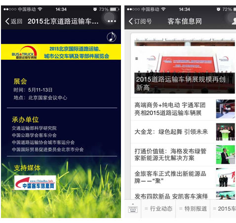 為方便大家提前了解展會情況,展會開展前期,中國客車信息網(wǎng)精心制作了手機版“觀展指南”,對展館方位、展期活動、企業(yè)活動等展會情況做了全面介紹,為參展人員提供了詳細全面的展前參考。
