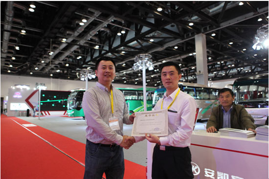 最終,金龍汽車集團、宇通客車、安凱客車、福田歐輝、中通客車、南京金龍、艾里遜、玉柴、安潔利德、歐科佳、康明斯等企業(yè)獲得了“最佳展臺創(chuàng)意獎”榮譽證書。