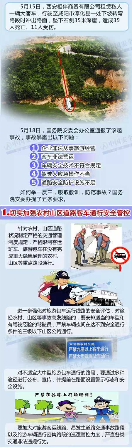 2015年5月15日15時27分左右,陜西省西安相伴商貿有限公司租賃私人一輛大客車,行駛至咸陽市淳化縣一處下坡轉彎路段時沖出路面,墜下右側35米深崖,造成35人死亡、11人受傷。事故暴露出企業(yè)非法從事旅游經營、客車非法營運、車輛安全技術不符合規(guī)定、駕駛人應急操作不當、道路安全防護設施不足等諸多問題。事故發(fā)生后,黨中央、國務院領導同志高度重視并作出重要批示,要求全力做好事故處置各項工作,舉一反三,警鐘長鳴,落實責任,嚴格制度,切實加強道路交通安全監(jiān)管,嚴防重特大事故發(fā)生。為深刻吸取事故教訓,進一步加強道路交通安全監(jiān)管等安全生產工作,堅決防范和有效遏制重特大事故,現(xiàn)提出以下要求: