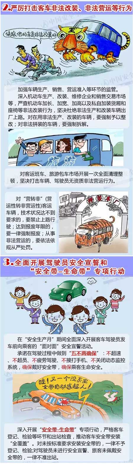 各地區(qū)、各有關部門和單位要進一步加強車輛生產、銷售、營運準入等環(huán)節(jié)的監(jiān)管,深入機動車生產、改裝、維修企業(yè)和銷售、交易市場等,嚴查機動車加長、加寬、加高以及私自加裝貨廂和座椅等非法改裝行為,堅決杜絕非法生產和改裝車輛出廠上路。對在用非法生產、改裝的車輛,要強制予以整改;對非法拼裝的車輛,要強制拆解。要對客運班車、旅游包車市場開展一次全面清理整頓,堅決打擊車輛、駕駛員無資質非法營運行為。對“營轉非”(營運性轉非營運性)客運車輛,技術狀況達不到要求的,要禁止上路行駛;達到報廢年限的,要一律強制報廢;從事非法營運的,要依法依規(guī)從嚴處罰。