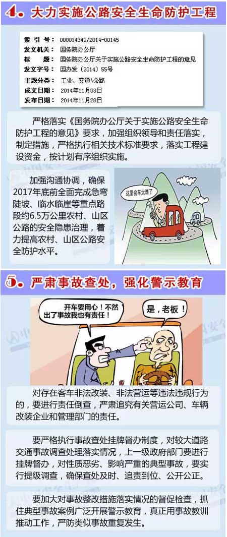 各地區(qū)、各有關部門和單位要嚴格落實《國務院辦公廳關于實施公路安全生命防護工程的意見》要求,加強組織領導和責任落實,制定措施,嚴格執(zhí)行相關技術標準要求,落實工程建設資金,按計劃有序組織實施。相關部門要加強溝通協(xié)調,加大對全國現(xiàn)有公路安全隱患的排查整治力度,確保2017年底前全面完成急彎陡坡、臨水臨崖等重點路段約6.5萬公里農村、山區(qū)公路的安全隱患治理,著力提高農村、山區(qū)公路安全防護水平。