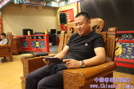 沈陽(yáng)宏運(yùn)旅游客運(yùn)有限公司董事長(zhǎng)景雪峰正在閱讀宇通T7畫(huà)冊(cè)