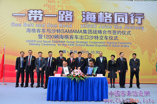 10月30日上午,“一帶一路海格同行”--海格客車(chē)與沙特客戶(hù)戰(zhàn)略協(xié)議簽署暨1200輛客車(chē)交車(chē)儀式在蘇州工業(yè)園區(qū)海格客車(chē)生產(chǎn)基地隆重舉行。蘇州工業(yè)園區(qū)管委會(huì)主任楊知評(píng)向海格客車(chē)沙特客戶(hù)代表遞交了金鑰匙。蘇州金龍海格客車(chē)總經(jīng)理吳文文與沙特薩瑪瑪集團(tuán)CEO艾哈邁德簽署戰(zhàn)略合作協(xié)議。