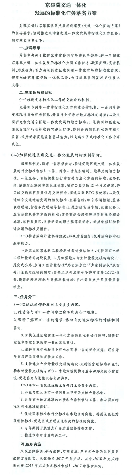 交通運(yùn)輸部辦公廳關(guān)于印發(fā)《京津冀交通一體化發(fā)展的標(biāo)準(zhǔn)化任務(wù)落實(shí)方案》的通知