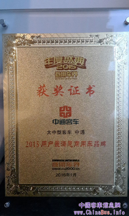 2016年1月15日,在北京舉行的“2015商用車界年度盛典”上,中通客車憑借2015年出色市場(chǎng)表現(xiàn)和良好市場(chǎng)反饋,贏得了用戶、活動(dòng)主辦方及業(yè)界人士的一致認(rèn)可,獲得兩項(xiàng)大獎(jiǎng)。其中,中通客車榮獲“2015用戶最滿意商用車品牌”稱號(hào),中通LCK6850EVG1純電動(dòng)城市客車則被評(píng)為2015年“年度公交”。