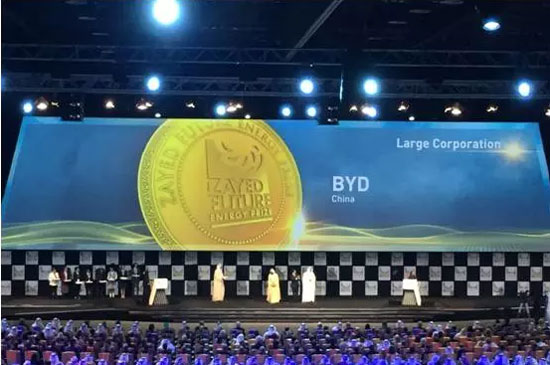 2016年1月18日,在阿聯(lián)酋阿布扎比超級豪華的國家展覽中心,全球矚目的扎耶德未來能源獎獲獎結果揭曉,比亞迪擊敗入圍最后一輪的兩家世界500強企業(yè),歷史性的摘得該獎桂冠,成為中國首家獲得大型企業(yè)類獎項的企業(yè)。比亞迪也成為全球唯一一家包攬該獎項大型企業(yè)類獎和個人終身成就獎的企業(yè)。這是中國企業(yè)歷史性的一刻,這也是全球可再生能源發(fā)展史上新的輝煌。