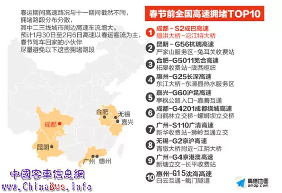 與十一期間的擁堵截然不同,春運(yùn)期間高速路況擁堵路段分布分散,且二三線城市周邊高速車流增大。節(jié)前的1月30日至2月6日高速車流以返鄉(xiāng)回家的客流為主,其中最擁堵的TOP3高速分別為:成都的S2成巴高速(福洪大橋-沱江特大橋)、昆明的G56杭瑞高速(嚴(yán)家山服務(wù)區(qū)-兔耳關(guān)收費(fèi)站)、合肥的G5011蕪合高速(柘皋收費(fèi)站-隴西樞紐)。節(jié)后2月13日開始,返程客流激增,全國高速又開始擁堵加重。
