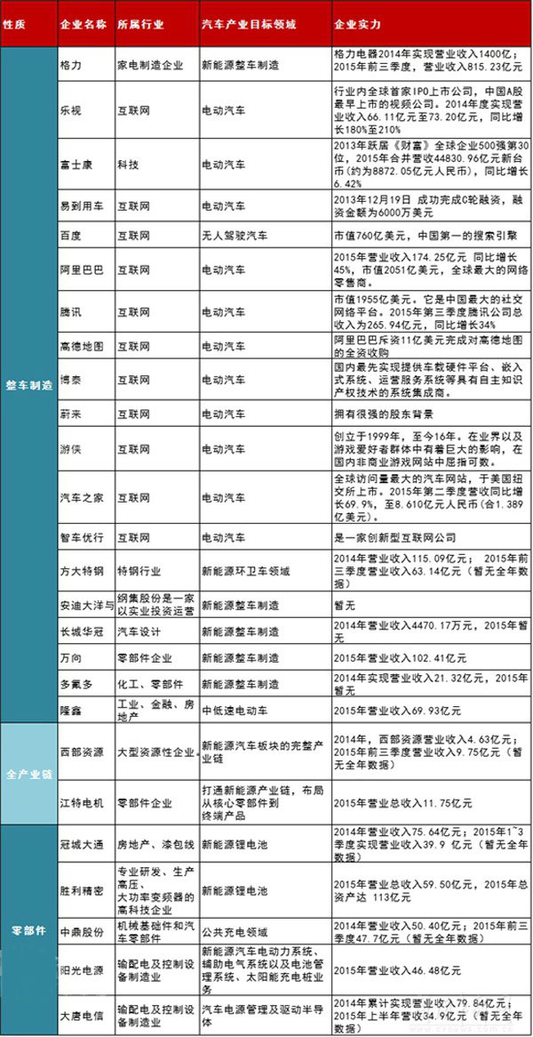 2016年3月份消息:近期,格力高調(diào)宣布要跨界新能源汽車,早就跨了界的樂視則自信滿滿開始放大招,新能源汽車市場被這些外來者攪動(dòng)的熱鬧極了。繁花背后,新能源汽車領(lǐng)域到底涌進(jìn)來多少這樣的攪局者呢?經(jīng)統(tǒng)計(jì),目前進(jìn)入新能源汽車整車制造以及電池等關(guān)鍵零部件制造領(lǐng)域的全新外來企業(yè),橫跨多個(gè)領(lǐng)域,數(shù)目已達(dá)26家之多。現(xiàn)在,小編就為您梳理這些企業(yè)的簡要信息,僅供參考。