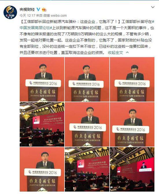 3月21日,在2016年中國發(fā)展高層論壇題為“構建產業(yè)新體系,加快建設制造強國”的分組會上,工信部部長苗圩表示,確實有少部分企業(yè)在局部的地區(qū)出現(xiàn)“騙補”。但這不是大面積的事件,也不像有的媒體報道的出現(xiàn)了7萬~9萬輛的騙補這么大的規(guī)模。我們正在全國范圍內進行核查,不管有多少輛,發(fā)現(xiàn)一起絕對處置一起。