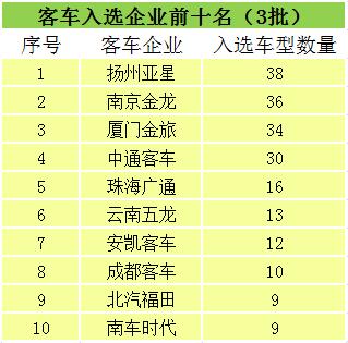第三批《新能源汽車(chē)推廣應(yīng)用推薦車(chē)型目錄》共包含309款車(chē)型,依然以純電動(dòng)車(chē)型為主,占比超過(guò)80%。其中,新能源客車(chē)302款,宇通、蘇州金龍、廈門(mén)金龍、廈門(mén)金旅、中通、安凱、福田、南京金龍等品牌均在列,然而,宇通、蘇州金龍、廈門(mén)金龍這三家企業(yè)的入選車(chē)型數(shù)量已掉出前十。值得一提的是,北汽福田BJ6123FCEVCH作為唯一一款燃料電池城市客車(chē)收入目錄。