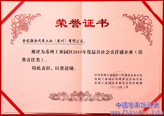 近日,蘇州工業(yè)園區(qū)工委管委會公布了2015年度“最具社會責(zé)任感企業(yè)”、企業(yè)社會責(zé)任建設(shè)“優(yōu)秀品牌活動”和“創(chuàng)新案例”獲獎名單。蘇州金龍海格客車獲評2015年度“最具社會責(zé)任感企業(yè)”之消費(fèi)責(zé)任類獎項(xiàng)。