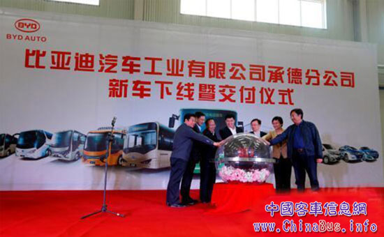 2016年4月18日,承德比亞迪新車下線暨交付儀式在承德市高新技術(shù)產(chǎn)業(yè)開發(fā)區(qū)的比亞迪新能源客車基地舉行。儀式上,比亞迪向承德公交集團(tuán)交付了首批20輛K7純電動(dòng)客車的“金”鑰匙,正式拉開基地新能源客車下線序幕。河北省、承德市各級(jí)領(lǐng)導(dǎo)、企業(yè)雙方領(lǐng)導(dǎo)、媒體及客戶嘉賓等百余人共同見證了這一歷史性時(shí)刻。