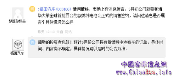 4月26日訊 福田汽車周一在上證e互動(dòng)平臺(tái)表示,預(yù)計(jì)5月份公司將有氫燃料電池客車的訂單。