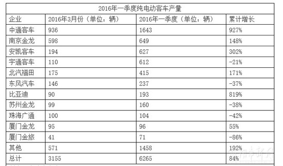 進(jìn)入第二季度,全國(guó)純電動(dòng)汽車市場(chǎng)升溫,作為純電動(dòng)汽車的重要組成部分——客車市場(chǎng)卻未能擺脫政府的“騙補(bǔ)”審查與開年淡季的影響。今年1-3月,國(guó)內(nèi)純電動(dòng)客車市場(chǎng)累計(jì)生產(chǎn)6265輛,同比增長(zhǎng)只有84%,相比去年一季度365%的同比增幅,今年一季度純電動(dòng)客車市場(chǎng)的增幅,略顯寒磣,也黯然失色。
