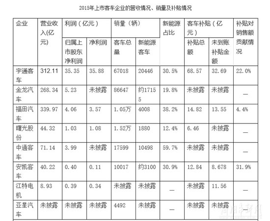 據(jù)了解,宇通客車,2015年新能源客車銷售收入達(dá)139.7553億元,占總收入44.7%;金龍客車,包括大金龍、小金龍和蘇州金龍前三季度新能源預(yù)收賬款共計(jì)8.51億元;安凱客車2015年純電動(dòng)客車超2200輛,插電式混合動(dòng)力客車近900輛;中通客車2015年前三季度獲補(bǔ)貼12億元,2015年銷插電式混合動(dòng)力客車2111輛;亞星汽車今年利潤(rùn)將達(dá)1500到2500萬(wàn)元;江特電機(jī)的九龍汽車完成了3.39億元利潤(rùn);福田汽車的客車和輕卡獲15.13億元補(bǔ)貼,大中客車銷售收入達(dá)31.9億元;曙光股份的黃??蛙囦N售收入達(dá)15.7701億元。從以上這些企業(yè)的情況可以看出,新能源客車市場(chǎng)雖然一直處于風(fēng)口浪尖,但是企業(yè)在新能源客車領(lǐng)域還是收獲頗豐的。
