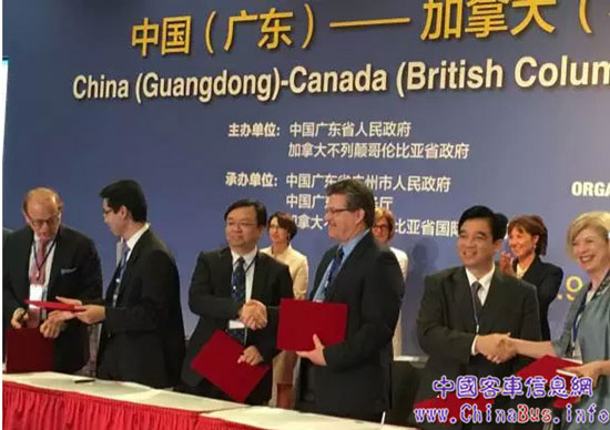 胡春華(后排右三)、許勤(后排右二)以及加拿大政府高官見證比亞迪董事長王傳福(前排左四)與圣艾伯特市代表簽署大巴訂單