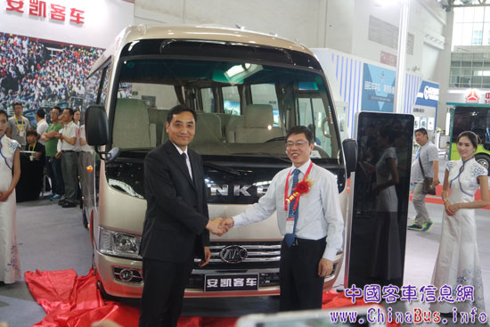 安凱客車董事長(zhǎng)戴茂方和交通運(yùn)輸部科學(xué)研究院黨委書記周曉航共同為寶斯通K7新車上市揭幕