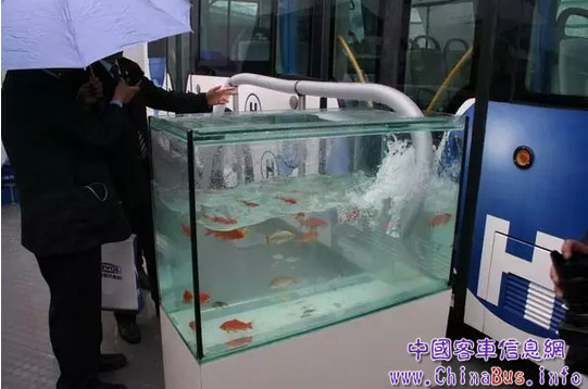 2008年4月北京國(guó)際車展,福田汽車與清華大學(xué)、億華通共同研發(fā)的氫燃料電動(dòng)客車用“尾氣養(yǎng)魚”向公眾展示了其零污染、零排放的特點(diǎn)