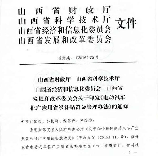 日前,為貫徹落實山西省人民政府《關(guān)于加快推進(jìn)電動汽車產(chǎn)業(yè)發(fā)展和推廣應(yīng)用實施意見》(晉政辦發(fā)[2015]115號),山西省財政廳、科技廳、經(jīng)信委、發(fā)改委聯(lián)合制定印發(fā)了《電動汽車推廣應(yīng)用省級省級補(bǔ)貼資金管理辦法》。