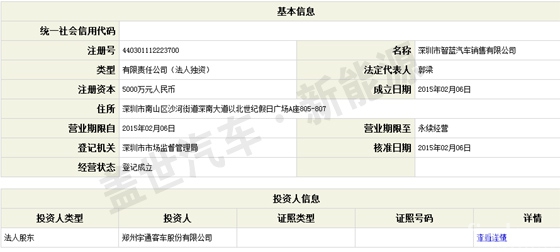 蓋世汽車·新能源從深圳市市場(chǎng)監(jiān)督管理局獲悉,深圳市智藍(lán)汽車銷售有限公司是鄭州宇通客車股份有限公司的全資子公司,而深圳普天新能源汽車營(yíng)銷有限公司是普天新能源汽車(山東)有限公司的全資子公司。