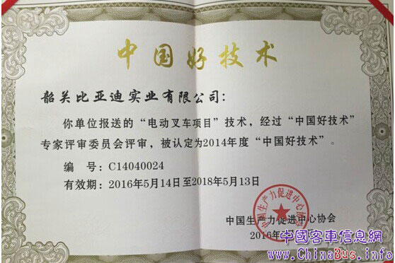 "中國(guó)好技術(shù)"評(píng)選活動(dòng)由中國(guó)生產(chǎn)力促進(jìn)中心協(xié)會(huì)于2014年啟動(dòng),活動(dòng)以全國(guó)2599個(gè)各級(jí)生產(chǎn)力促進(jìn)中心為開(kāi)展單位,目的是把蘊(yùn)藏在民間的好技術(shù)變成好產(chǎn)品,把好產(chǎn)品推向國(guó)內(nèi)外市場(chǎng),讓中國(guó)的好產(chǎn)品變成中國(guó)的好品牌,讓中國(guó)的好品牌產(chǎn)生巨大的經(jīng)濟(jì)效益和社會(huì)效益。同時(shí),這項(xiàng)活動(dòng)也是為深入貫徹落實(shí)黨中央、國(guó)務(wù)院關(guān)于實(shí)施創(chuàng)新驅(qū)動(dòng)發(fā)展戰(zhàn)略和"大眾創(chuàng)業(yè)、萬(wàn)眾創(chuàng)新"的精神,加快發(fā)展科技服務(wù)業(yè),實(shí)現(xiàn)創(chuàng)新創(chuàng)業(yè)創(chuàng)富的中國(guó)夢(mèng)而開(kāi)展的。2014年度"中國(guó)好技術(shù)"評(píng)選活動(dòng)全國(guó)共征集科技創(chuàng)新產(chǎn)品和可產(chǎn)業(yè)化技術(shù)成果近千項(xiàng),經(jīng)過(guò)40多位國(guó)內(nèi)外知名專(zhuān)家兩輪嚴(yán)格評(píng)審,最終遴選出154項(xiàng)先進(jìn)實(shí)用、貼近民生的"中國(guó)好技術(shù)"成果。比亞迪叉車(chē)項(xiàng)目憑借著先進(jìn)的技術(shù)優(yōu)勢(shì),被認(rèn)定為2014年度"中國(guó)好技術(shù)"。