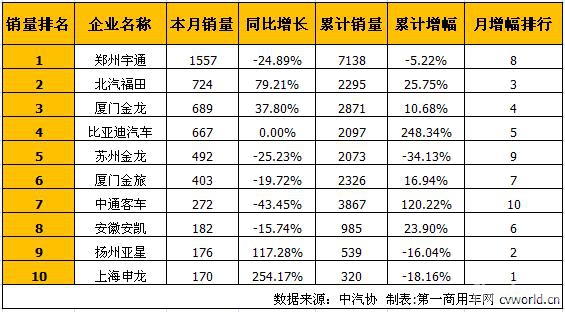 宇通居首 5月大型客車銷量排行前十