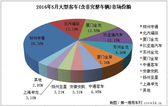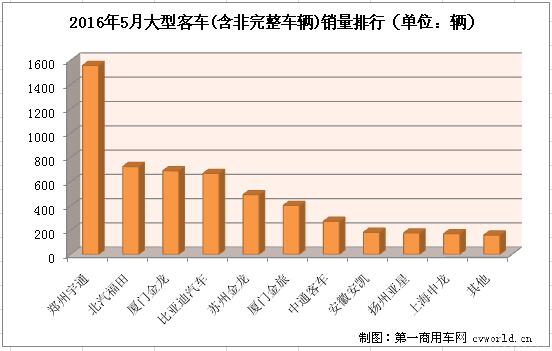 2016年5月,國內(nèi)大型客車(含非完整車輛)市場銷售5491輛,銷量排名前十的企業(yè)共計銷售5332輛,占據(jù)整個大型客車銷量份額的97.10%,排名如下: