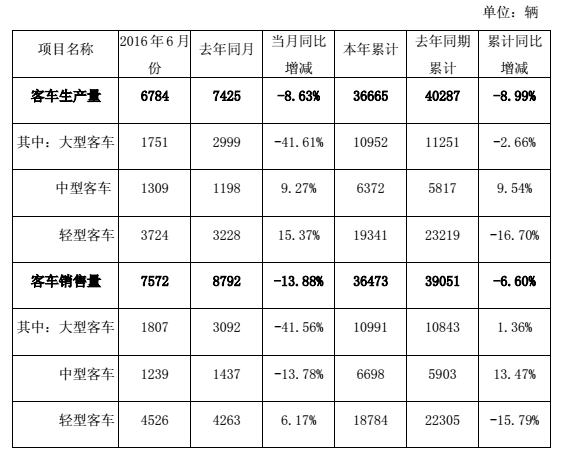 本網(wǎng)訊 7月6日傍晚,廈門金龍汽車集團(tuán)股份有限公司(簡稱“金龍汽車”)發(fā)布2016年6月份客車產(chǎn)銷數(shù)據(jù)快報??靾箫@示,金龍汽車6月份客車銷售量為7572輛,同比下降13.88%;1~6月份累計銷售客車36473輛,同比下降6.60%。