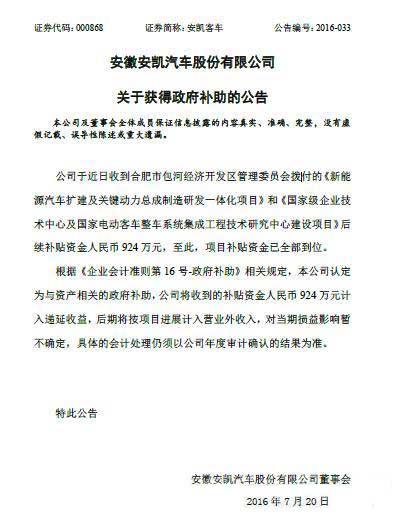 7月20日,安徽安凱汽車股份有限公司發(fā)布公告稱,近日收到合肥市包河經(jīng)濟開發(fā)區(qū)管理委員會撥付的《新能源汽車擴建及關(guān)鍵動力總成制造研發(fā)一體化項目》和《國家級企業(yè)技術(shù)中心及國家電動客車整車系統(tǒng)集成工程技術(shù)研究中心建設(shè)項目》后續(xù)補貼資金人民幣924萬元,至此,項目補貼資金已全部到位。