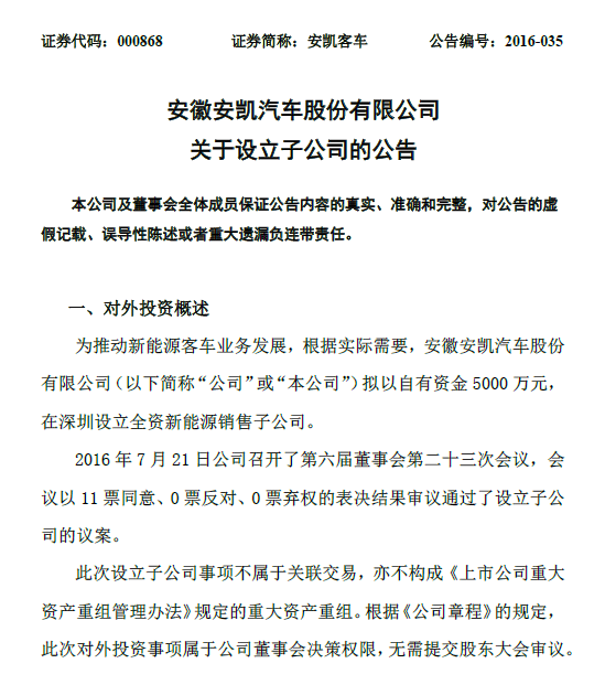 安凱客車(chē)7月21日晚間公告,為推動(dòng)新能源客車(chē)業(yè)務(wù)發(fā)展,根據(jù)實(shí)際需要,公司擬以自有資金5000萬(wàn)元,在深圳設(shè)立全資新能源銷售子公司。