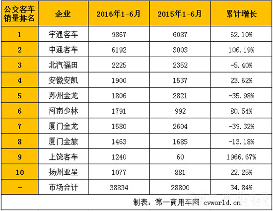 據(jù)中國(guó)客車(chē)信息統(tǒng)計(jì)網(wǎng)數(shù)據(jù)顯示,2016年1-6月份,國(guó)內(nèi)客車(chē)市場(chǎng)累計(jì)銷(xiāo)售公交客車(chē)38834輛,同比增長(zhǎng)34.84%,占據(jù)5米以上客車(chē)市場(chǎng)總體銷(xiāo)量的36.52%。具體排名如下: